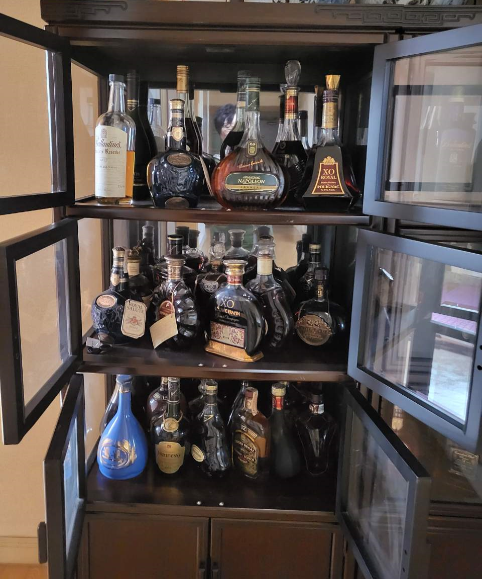 오래된 진열장 깊숙히 보관한 옛날 양주와 위스키