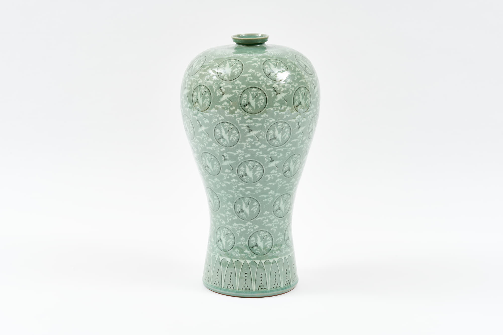 ‘매병’은 목이 길고 몸통이 둥근 병을 뜻합니다. 청자 상감 운학문 매병은 매병 형태의 고려청자에 구름과 학을 뜻하는 ‘운학문’이 정교하게 상감되어 장식된 작품입니다.