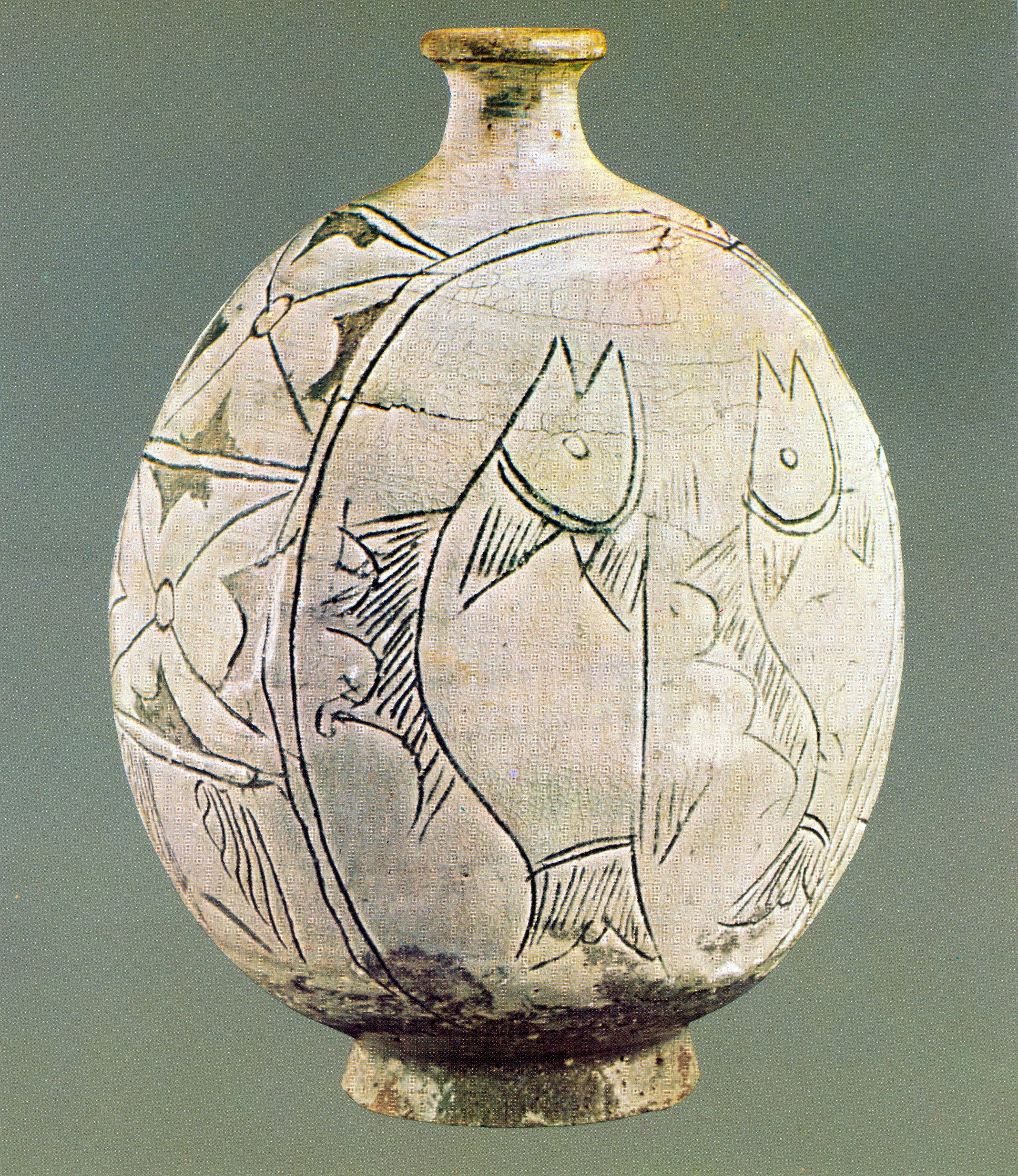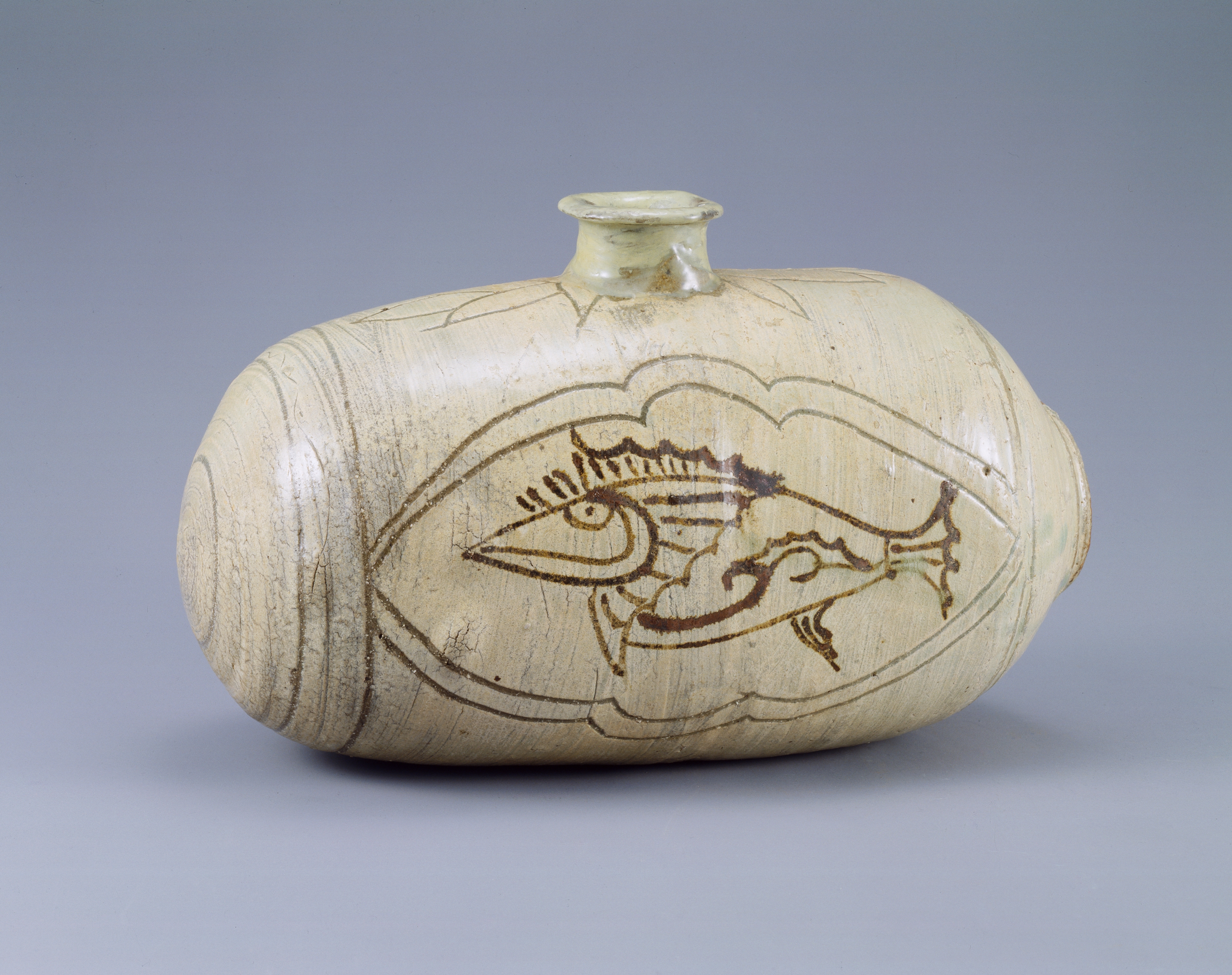 자라병은 기능보다 모양이 먼저 기억에 남는 기물이다. 납작하고 둥근 몸체 위에 길게 솟은 목이 자리해 전체적인 구도가 자라를 떠올리게 한다. 단순한 병인데도 작은 장난기 같은 생동감이 느껴지고, 보는 사람의 시선을 한 번에 붙잡는다. 도자기 안에서 동물을 형상화하려는 장인의 상상력이 자연스럽게 드러난 기물이라고 할 수 있다.